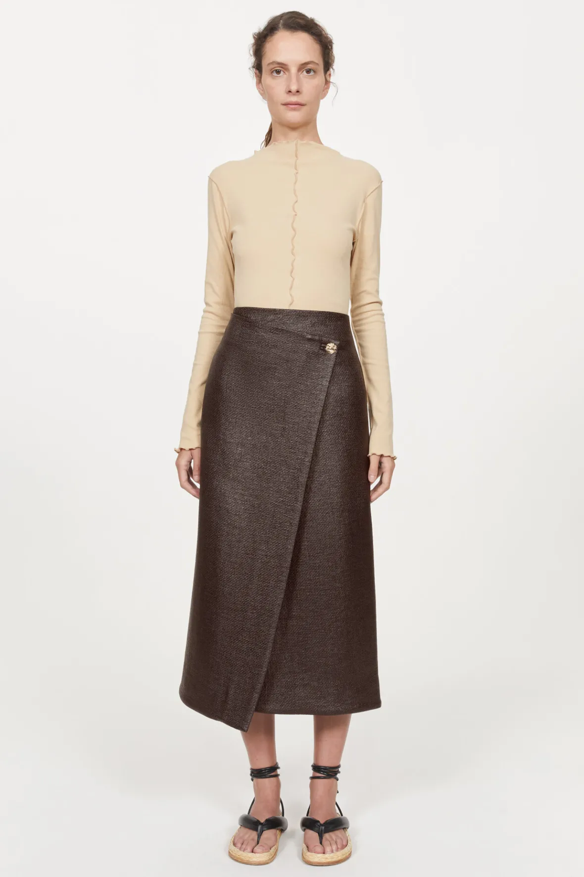 Adding Rich Texture To Seasonal Outfits, The Francis Skirt Is Presented In A Glossy Brown Basket Weave Fabrication. An A-Line Wrap Design, It Falls To A Mid-Length Hem And Fastens Asymmetrically With A Single, Sculptural Button. Take Yours Into Summer With Woven Flats And A Languid Blouse.