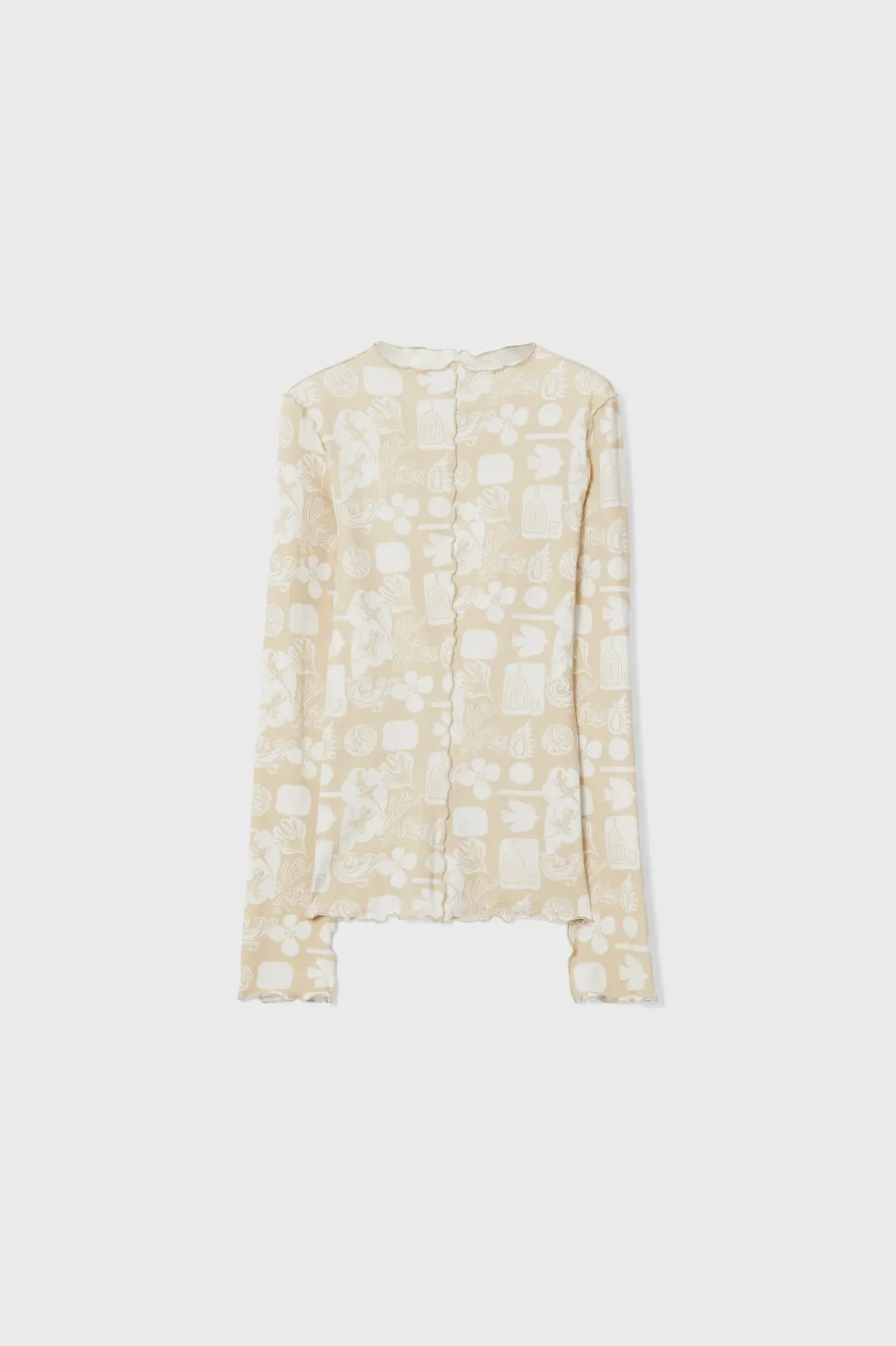 Made From Lightweight Organic Cotton Jersey, The Columbina Top Showcases A Beige And White Rendition Of The Surrealist Sketchbook Print. This Long-Sleeved Style Is Detailed With Lettuce Edging At The Neckline, Sleeves, Hemline And Center Front For Added Interest.