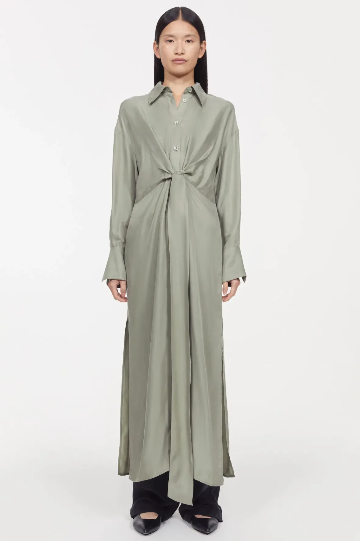 A Study In Soft Contrasts, The Apple Peach Design Is A Shirt Dress That Is Crafted From Sandwashed Twill That Ensures A Luxurious Handle. The Long-Sleeved Style Has A Classic Button-Down Front, And Self-Fastening Ties At The Waist That Create An Artful Gather Below The Bust. Wear Yours With A Pair Of Pointed Flats.