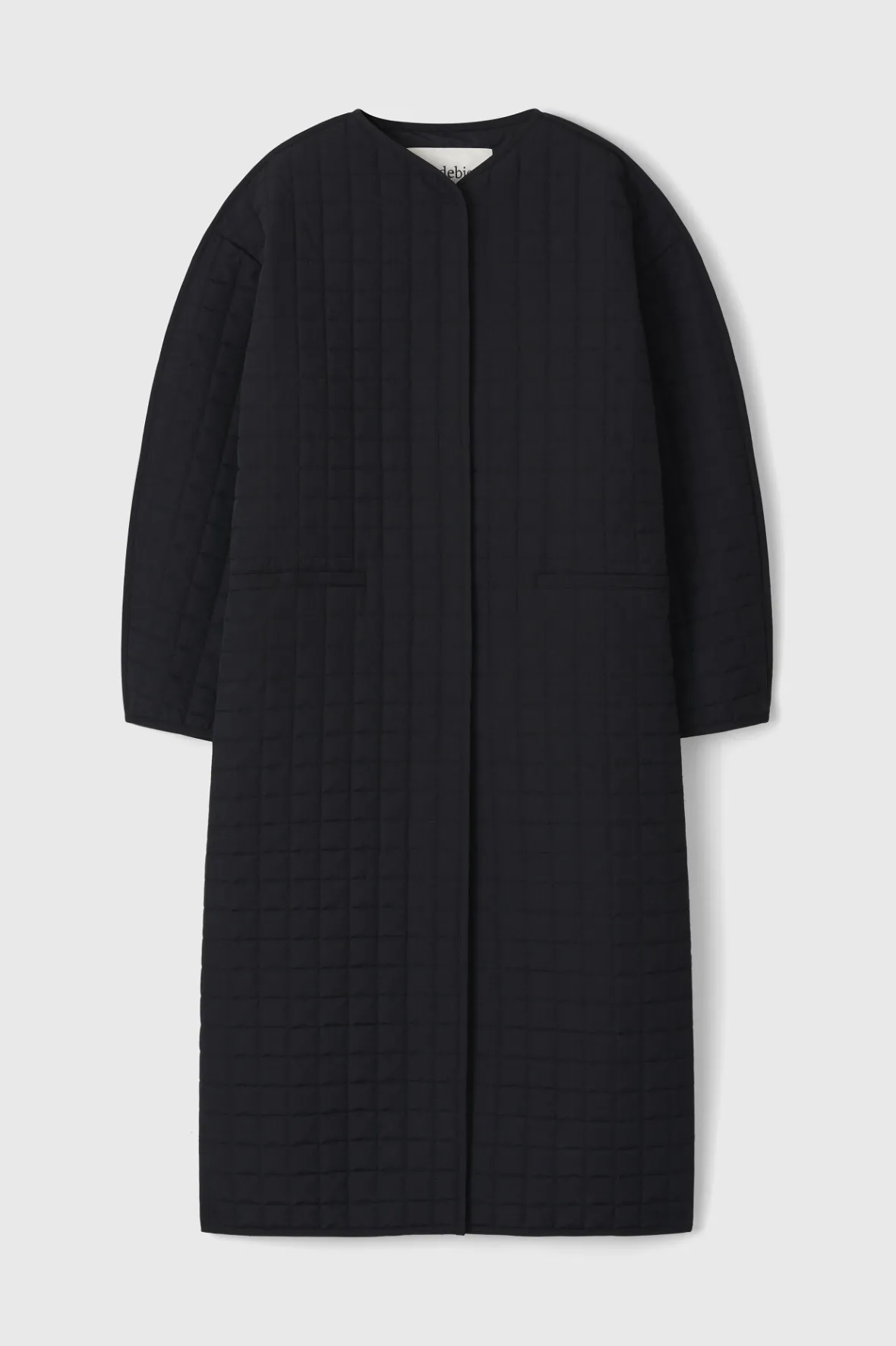 Nelly Is An Oversized Collarless Coat With A Classic Quilted Finish. Dropped Shoulders And Curved Sleeves With Binding Accentuate Its Relaxed Shape. The Coat Is Consciously Made From Grs-Certified Recycled Nylon And Fastens With Hidden Press Buttons. Two Welt Pockets At The Hip Allow You To Keep Small Items Close At Hand While On The Move.