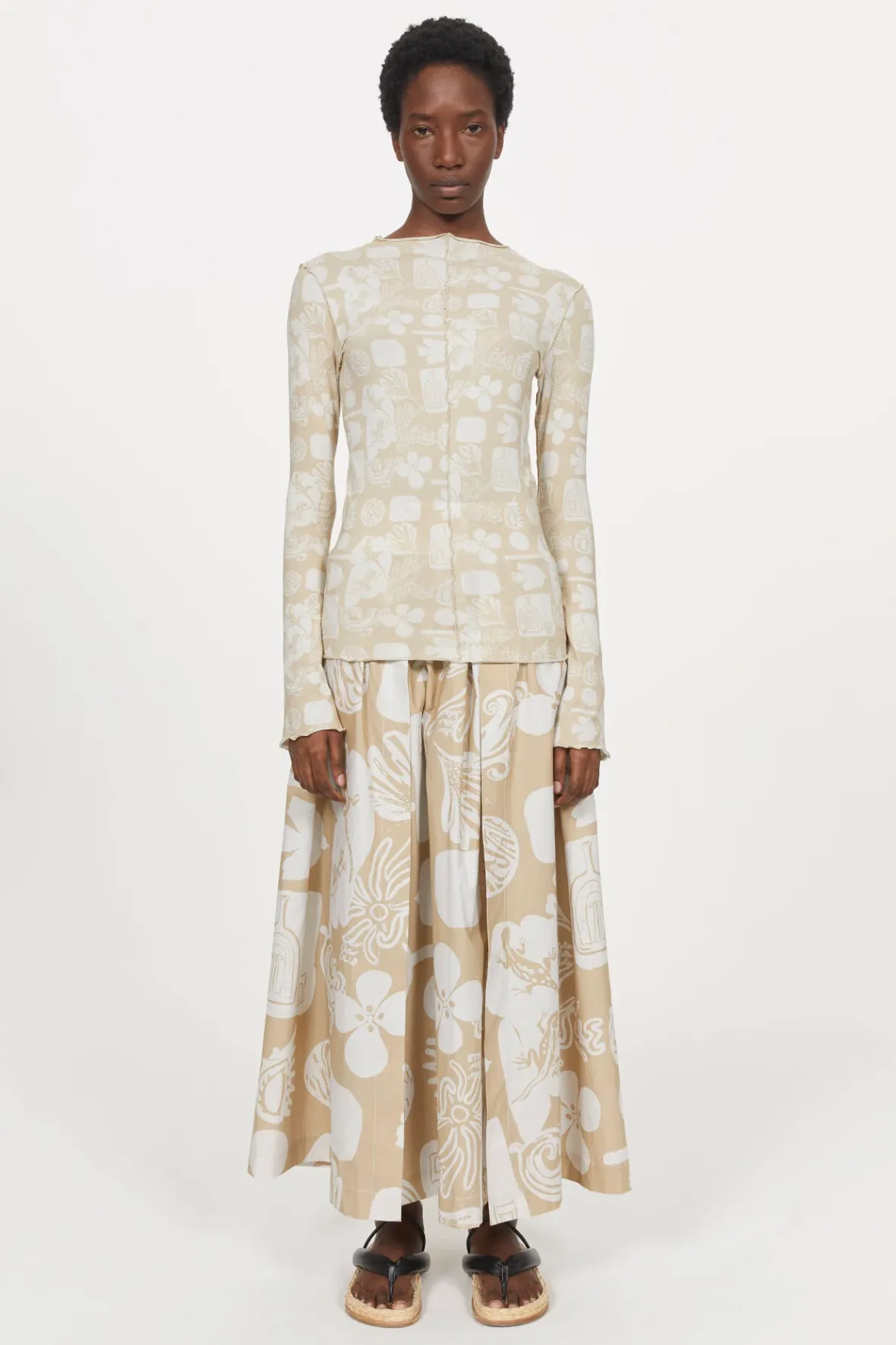 Made From Lightweight Organic Cotton Jersey, The Columbina Top Showcases A Beige And White Rendition Of The Surrealist Sketchbook Print. This Long-Sleeved Style Is Detailed With Lettuce Edging At The Neckline, Sleeves, Hemline And Center Front For Added Interest.